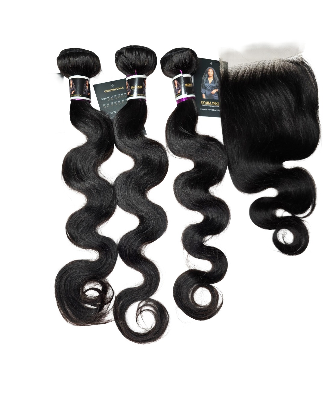 Bodywave bundle deal with 22”+22”+20” Bodywave bundles and a 16” 5×5 HD lace closure. 100% human hair for sew-ins & wig making.